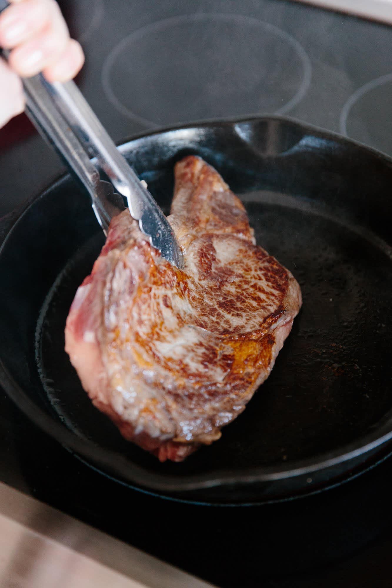 Pull out the skillet and carefully flip the steak using the tongs.